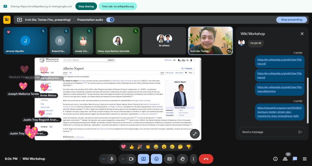 Building on earlier capacity-building efforts, CBSUA previously conducted the Intro to Wikipedia and Wiki Referencing Workshop in December. University students from the College of Education, alongside faculty members and personnel from the University Extension and Services Office (UESO) and the Knowledge Management Center (KMC), participated in the hybrid training held at the main campus in Pili and online. The workshop emphasized proper citation practices, responsible editing, and collaborative knowledge-building, which are core competencies in today’s academic and digital environments.