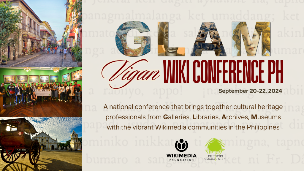 Submit your Paper Presentations and Scholarship Applications for the GLAM Wiki Conference Philippines 2024 on or before July 31, 2024. The GLAM Wiki Conference Philippines 2024 is national gathering that brings together cultural heritage professionals from Galleries, Libraries, Archives, Museums with the vibrant Wikimedia communities in the Philippines to exchange and share their experiences, new…